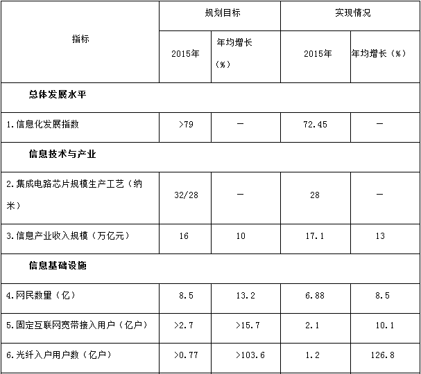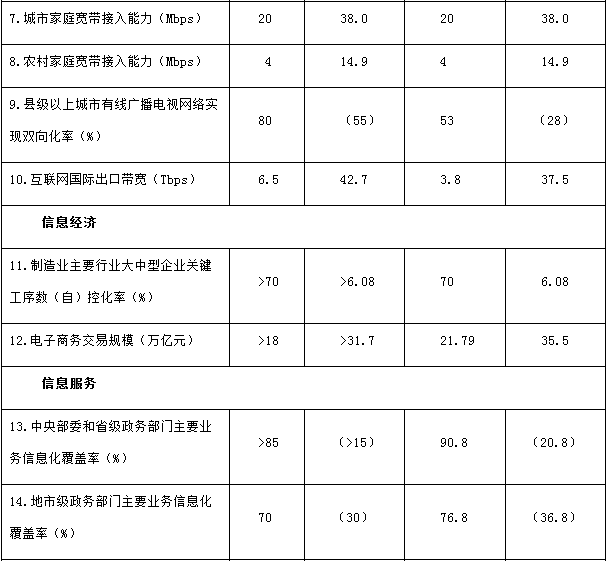 信息經濟全面發展。信息經濟新產業、新業態不斷成長,信息消費規模達到6萬億元,電子商務交易規模超過38萬億元,信息化和工業化融合發展水平進一步提高,重點行業數字化、網絡化、智能化取得明顯進展,網絡化協同創新體系全面形成。打破信息壁壘和孤島,實現各部門業務系統互聯互通和信息跨部門跨層級共享共用,公共數據資源開放共享體系基本建立,面向企業和公民的一體化公共服務體系基本建成,電子政務推動公共服務更加便捷均等。電信普遍服務補償機制進一步完善,網絡扶貧成效明顯,寬帶網絡覆蓋90%以上的貧困村。